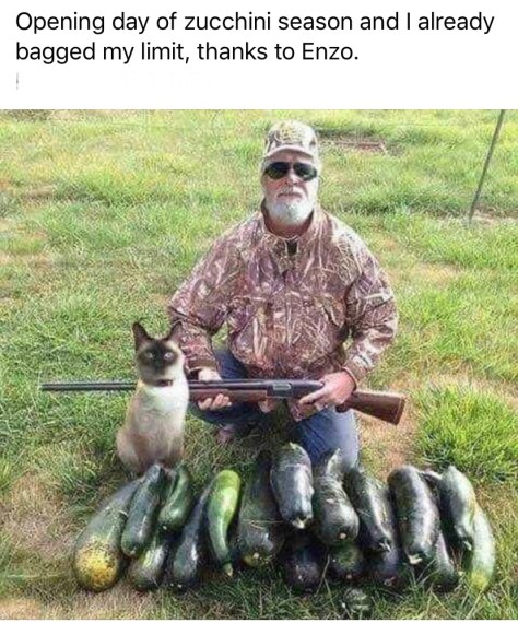 1. I’ve never really thought about zucchini hunting cats before. Perhaps they stalk their prey and alert the hunter with a smirk and slight tilt of the head?