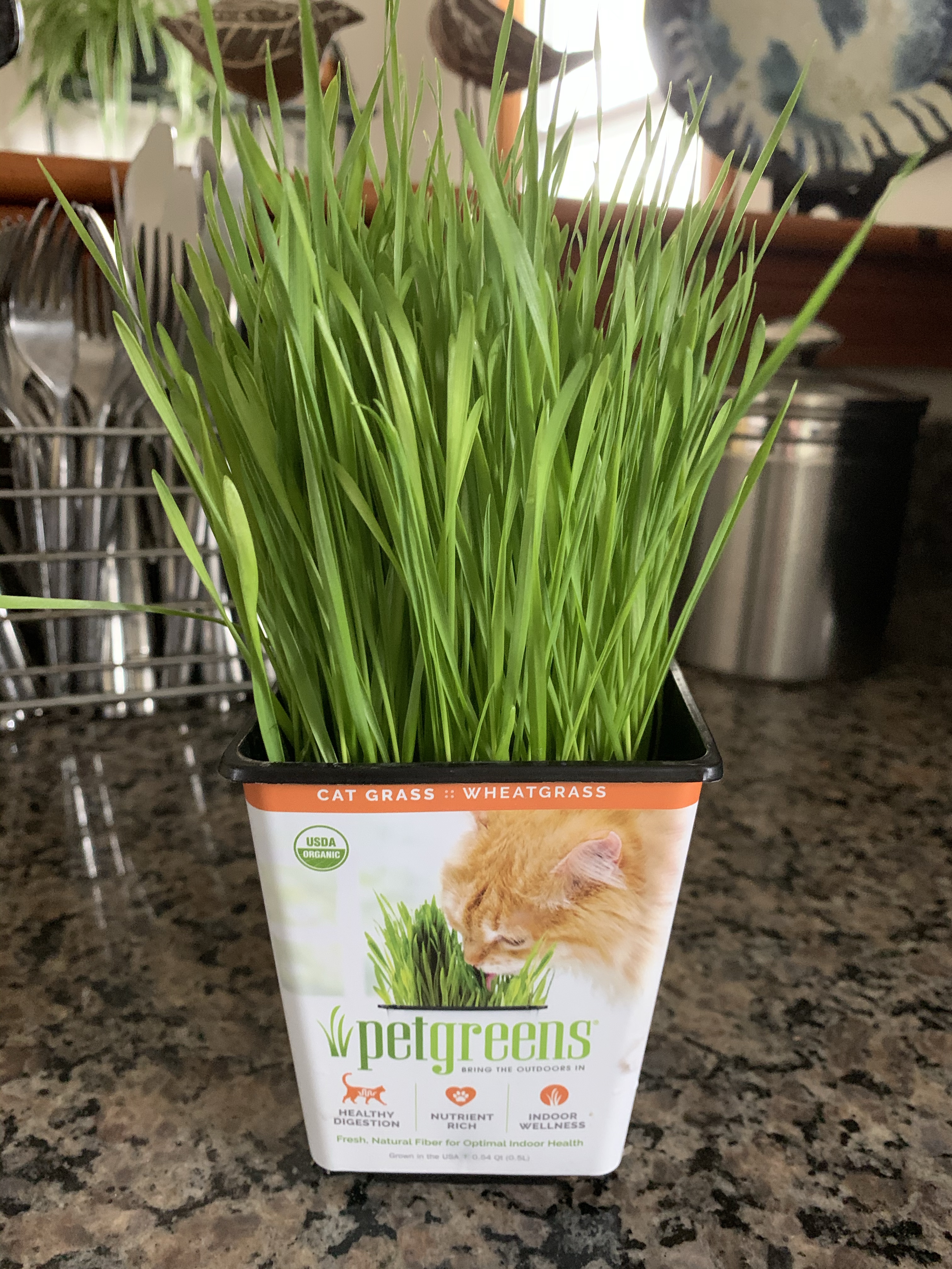 Results of his daily work outs? My spider plants that are being nibbled down to nubs. Enter kitty wheat grass.