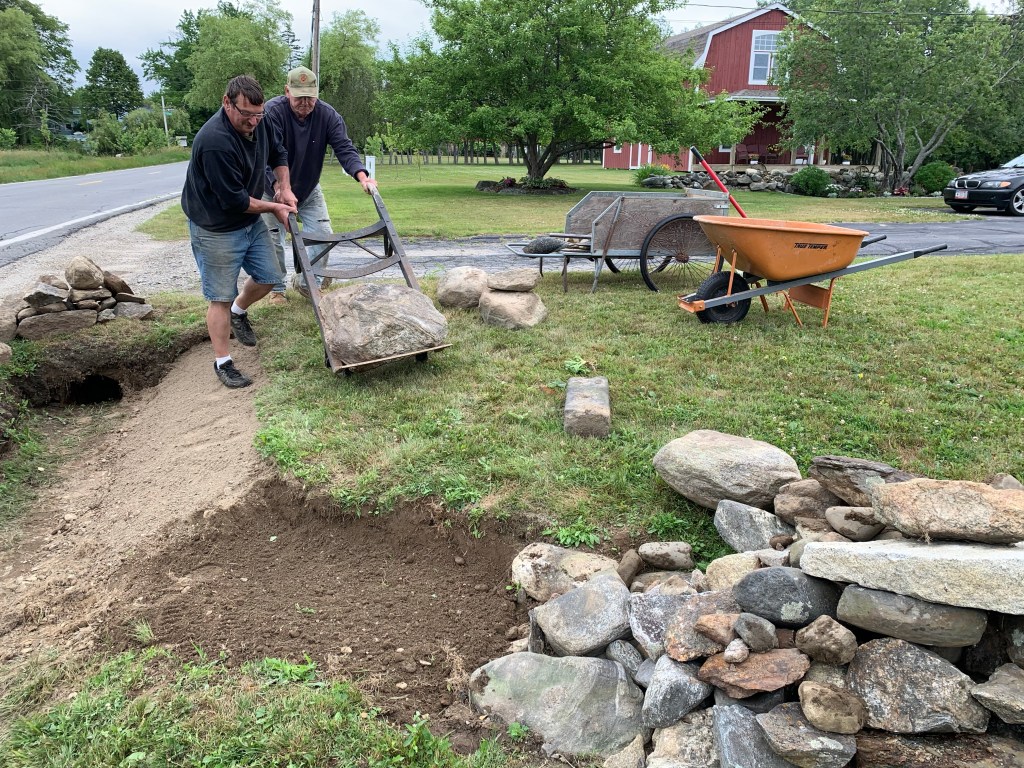 If you’ve never built a rock wall? (And I mean a real New England cement free rock wall, with rocks of all different shapes and sizes and weights… not the nice flat ones you buy at a landscapers) Trust me, it’s work!