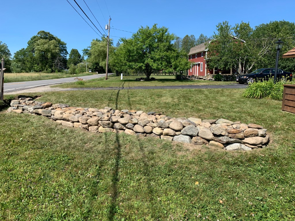 But it looks a lot better than it did…. and in 10-15 years when Maine’s notorious frost heaving and shifting earth crumbles this one? We’ll probably hire someone to rebuild it again because we’ll be too old and decrepit. Maybe then I can have a high wall.
