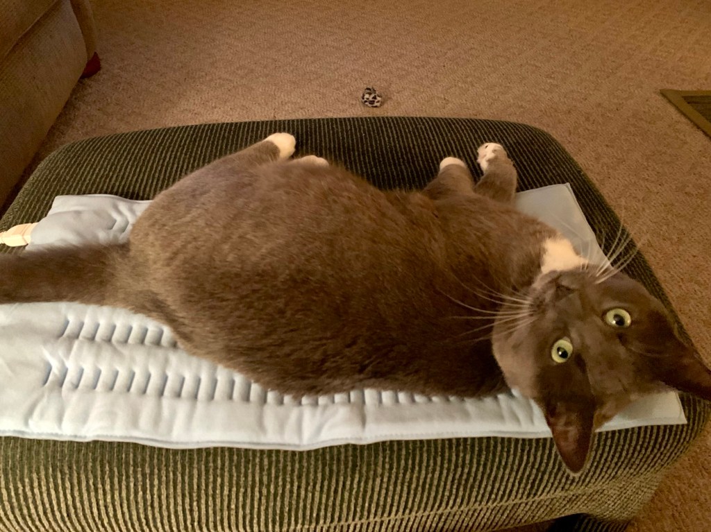 Yes, he’s commandeered my heating pad, and yes… if we don’t turn it on when he pounces on it we get the look.