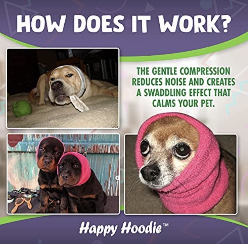 Our dog loves to be in her ThunderShirt during storms, and when she has her tight=fitting coat on in the winter, she often wants to stay in it for hours. But her head and ears are not covered. I can’t imagine her liking that.