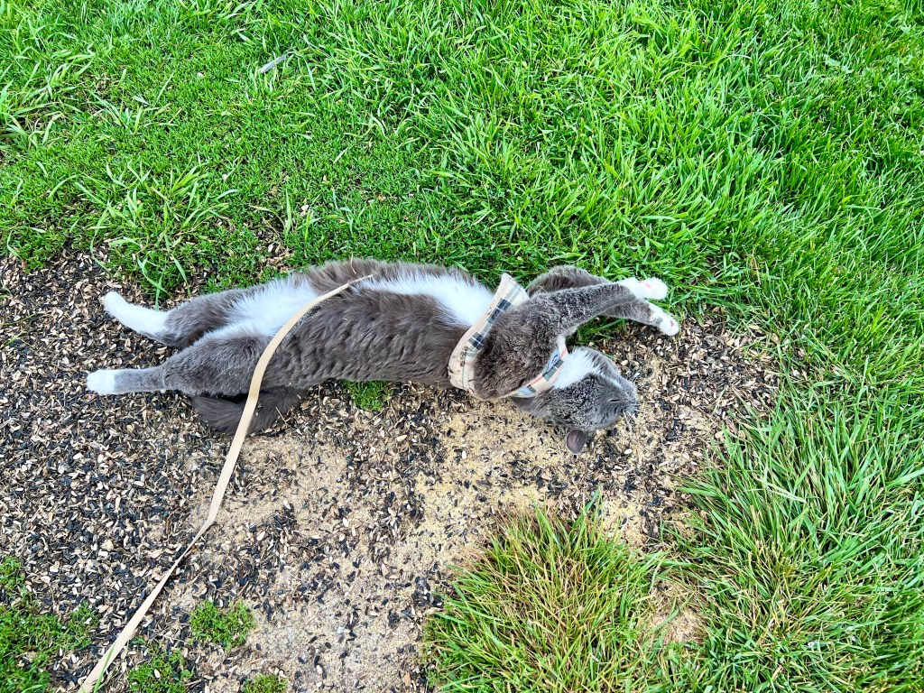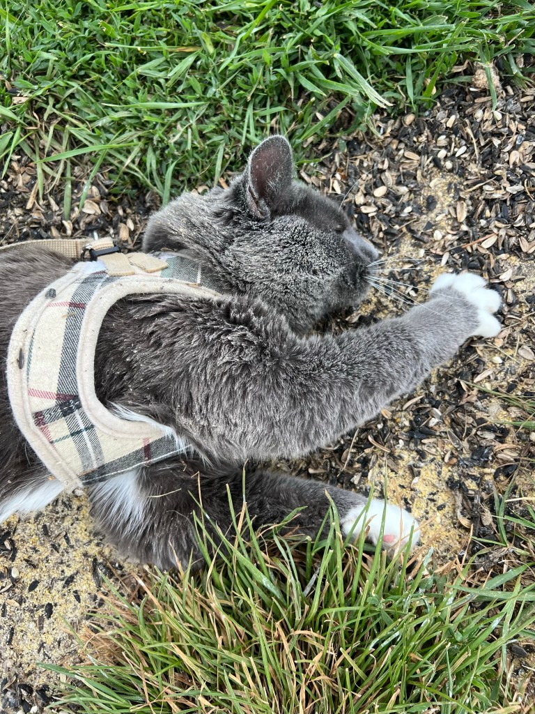And roll until he and his harness are filthy. The spot underneath the bird feeders that’s mixed with empty seed husks and poo is a favorite.