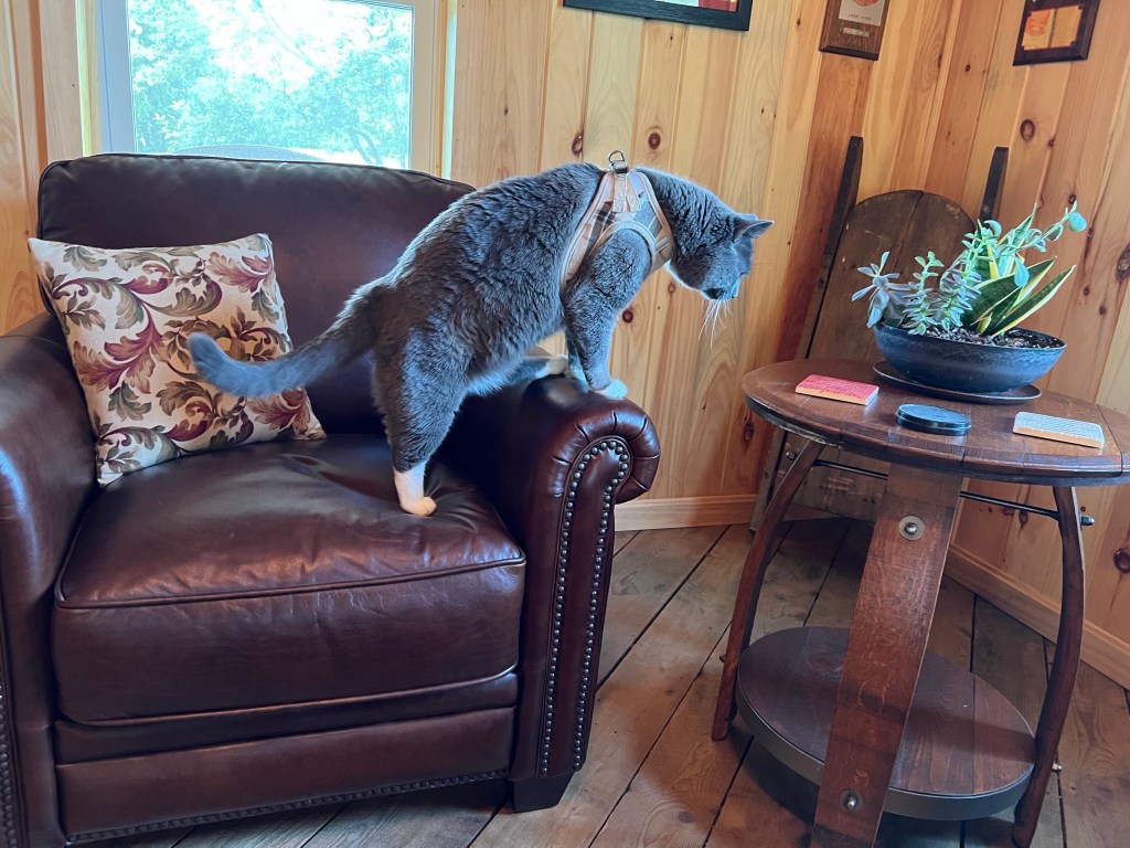 Hard to believe in the year since we adopted his Lordship, he’s never made it out to the man cave. There’s something about the barn which always gives him pause. Oh, he’ll walk around it and try to crawl underneath it.. but it took me a good 9 months to get him comfortable sitting on the porch. Then yesterday out of nowhere he scratched on the door….