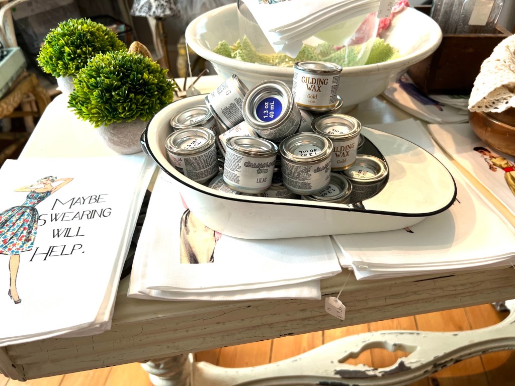 Vintage white enamel bed pan used as a display container? Now that’s fabulous.