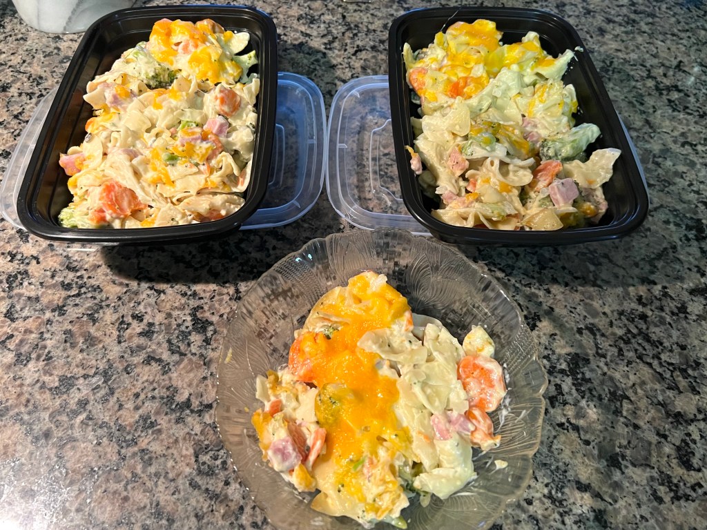 Day four and day five- a rich and creamy ham casserole with egg noodles, carrots, broccoli, onions, Parmesan and cheddar cheese. This is yummy, but produces even more leftovers.
