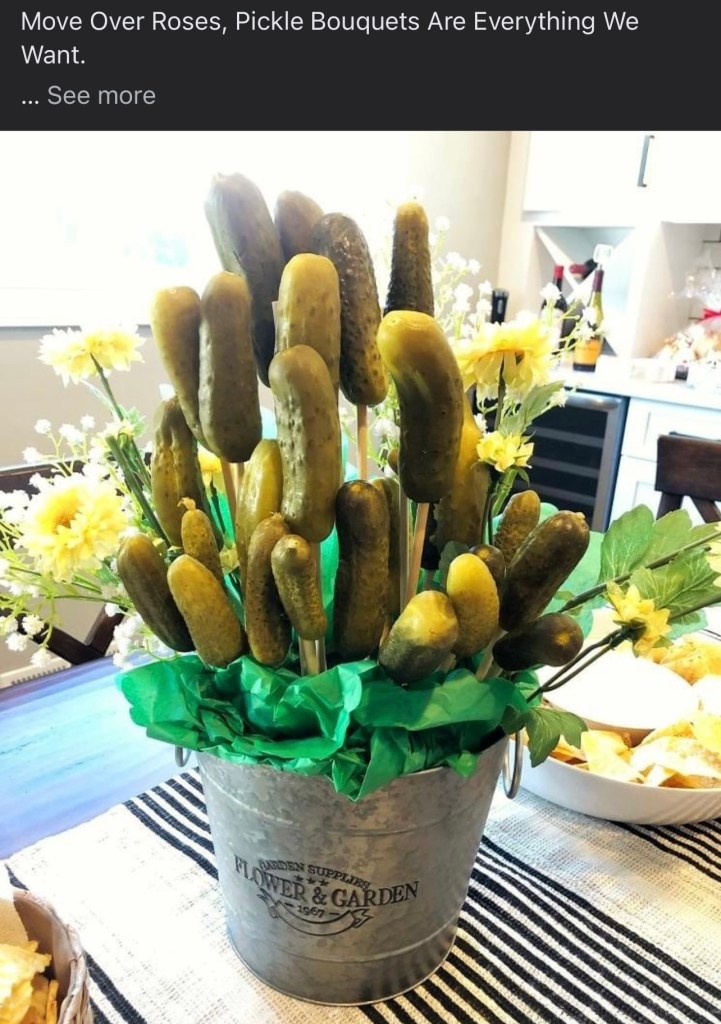 2. I’m intrigued and yet bewildered by the algorithms that seem to keep suggesting the weirdest things. Although pickles aren’t as weird as all the sex toys you once posted about. But, you know there are some people who love pickle’s, but I’d be hard pressed to be willing to send anyone a pickle bouquet……🤔