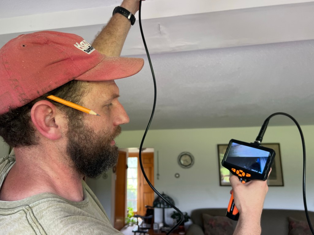 After one contractor quoted us $25,000 to fix it sight unseen, and another quoted $35,000 to completely rework the trusses, we despaired. But the guy who will be doing our back deck and windows agreed to give it a go and brought over some fun equipment to investigate.