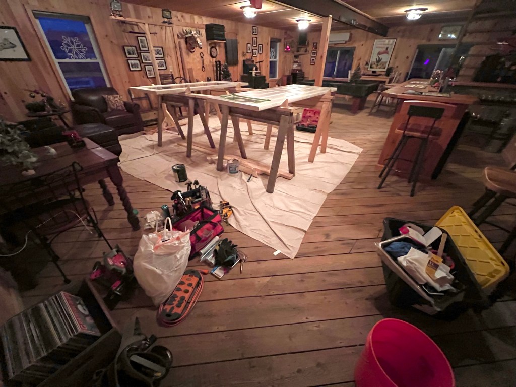 Yes. There’s now a painting station in the man cave/Barn Mahal. And the view from behind the bar looks a little different.
