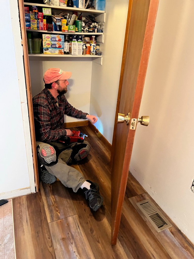 The flooring is coming along nicely. It’s not too dark, it will look beautiful once it’s finished and still in style in 2030….🤣