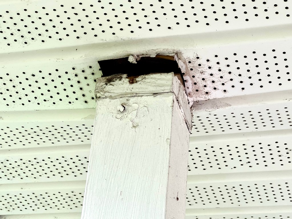The previous owner, who instead of fixing it just added little filler squares of wood and caulked, left us with a mess. Thankfully the posts are not load bearing.