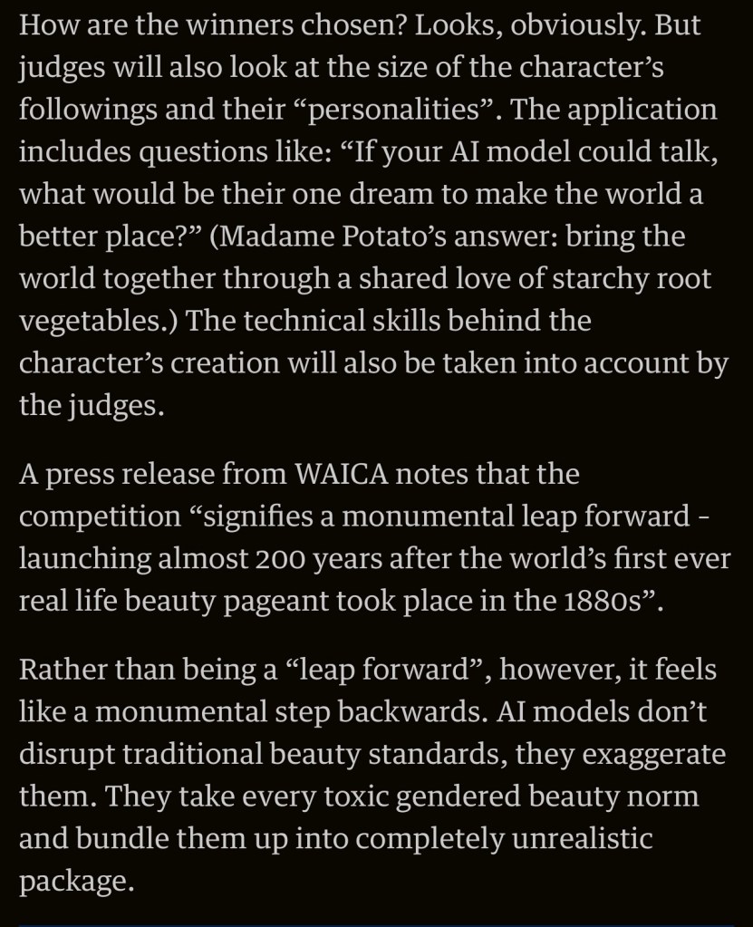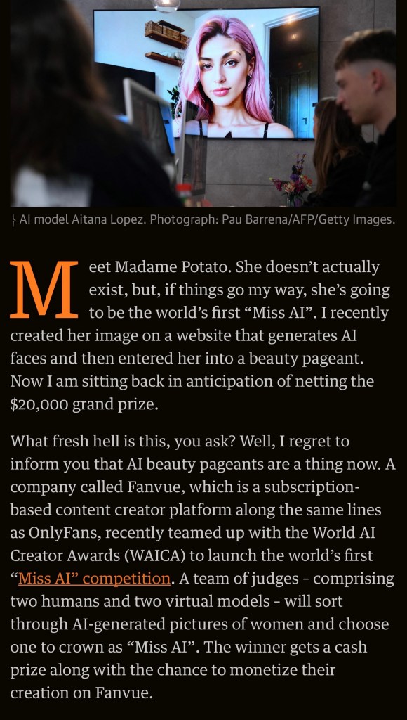 And if the idea of AI beauty contests isn’t high enough on the stupid scale? They named her Madame Potato. Is that supposed to be sexy… because I don’t get it.