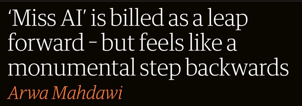 2. And why aren’t the judges AI judges? Wouldn’t they be the ones to know what digital beauty truly is? Boobs snd shaved underarms might not be important to them. Beauty might be in the placement of the 0’s and 1’s.