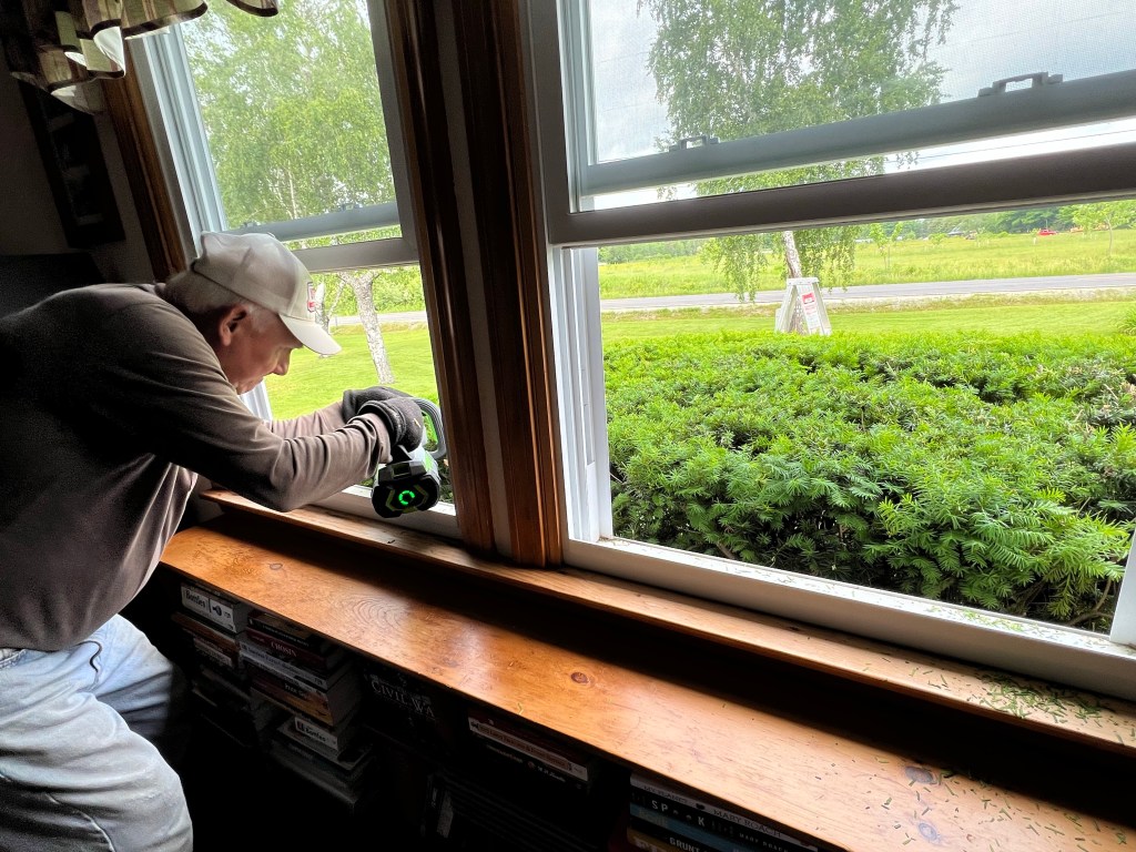 Did he use a leaf blower to send all the debris in the last photo back out the window?