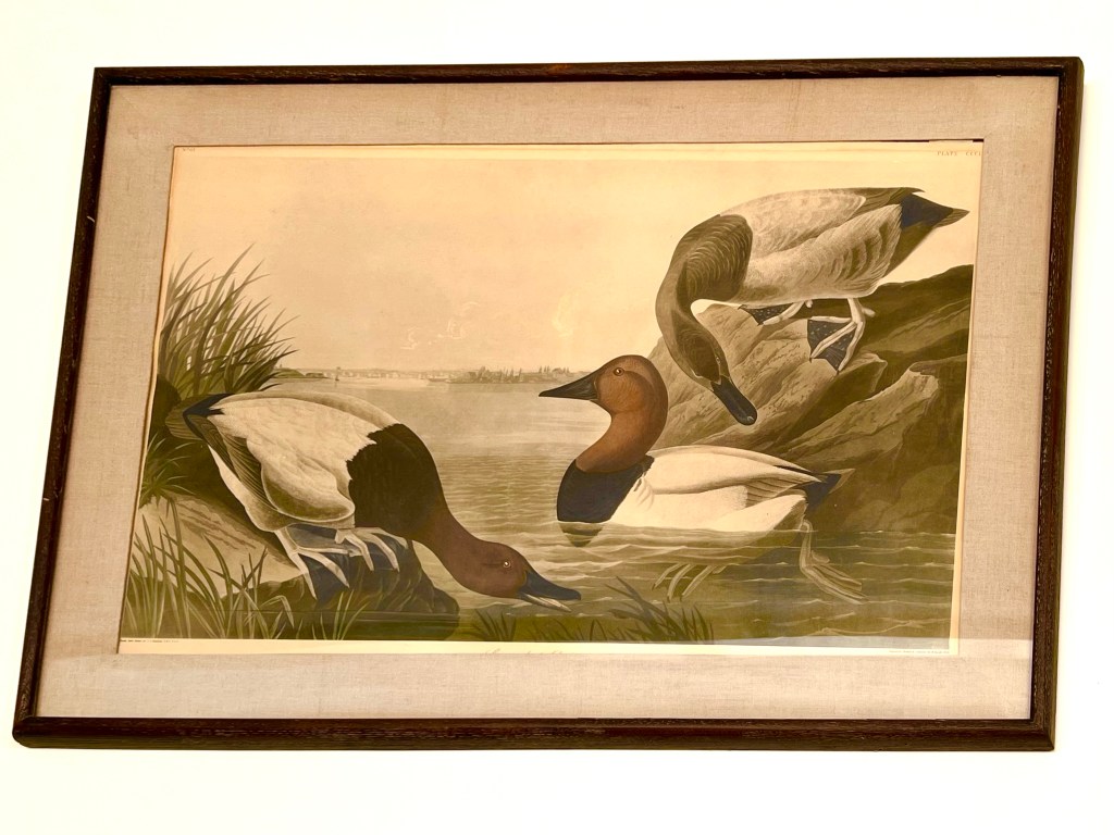 A large Audubon print of canvas back ducks in Baltimore harbor.