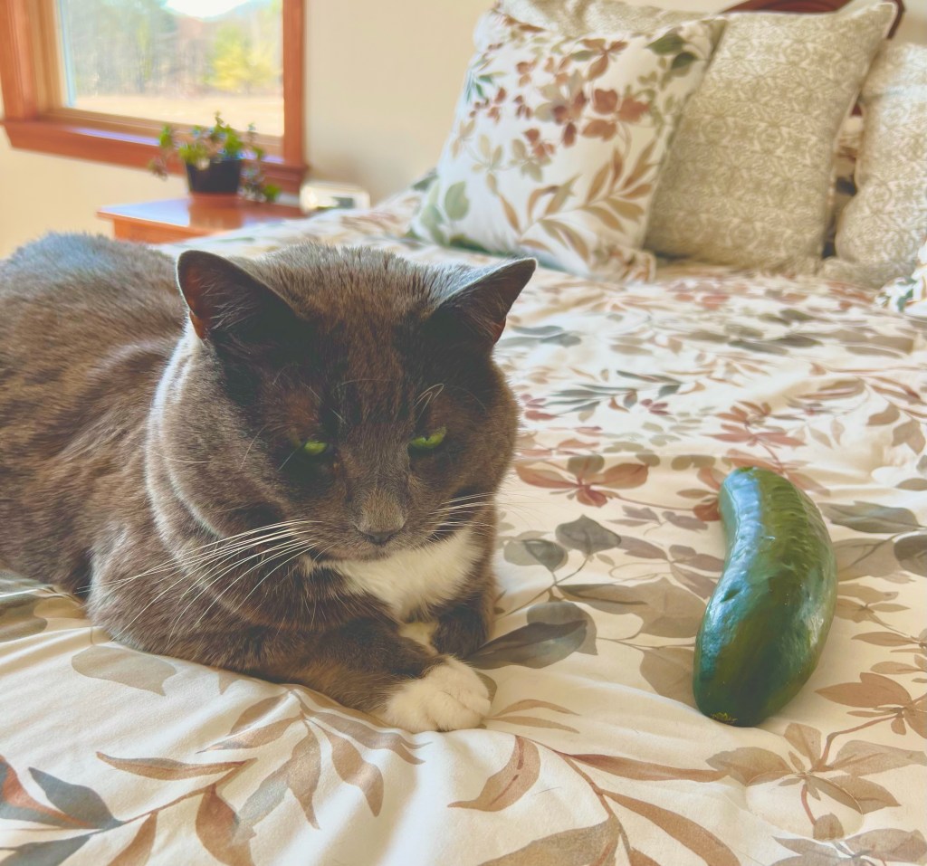 You are actually supposed to put the Cucumber behind the cat when it isn’t looking, but none of mine care.