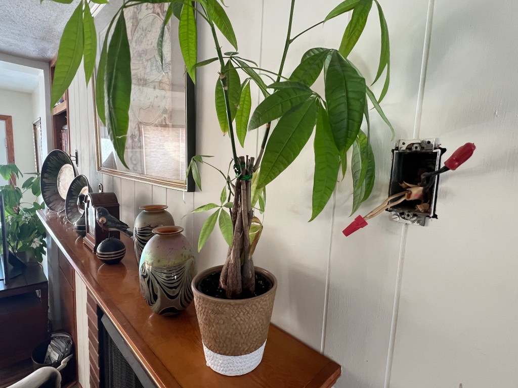 I walked into the living room after showering the other day and found the husband had removed our old wall sconces beside the mantle.