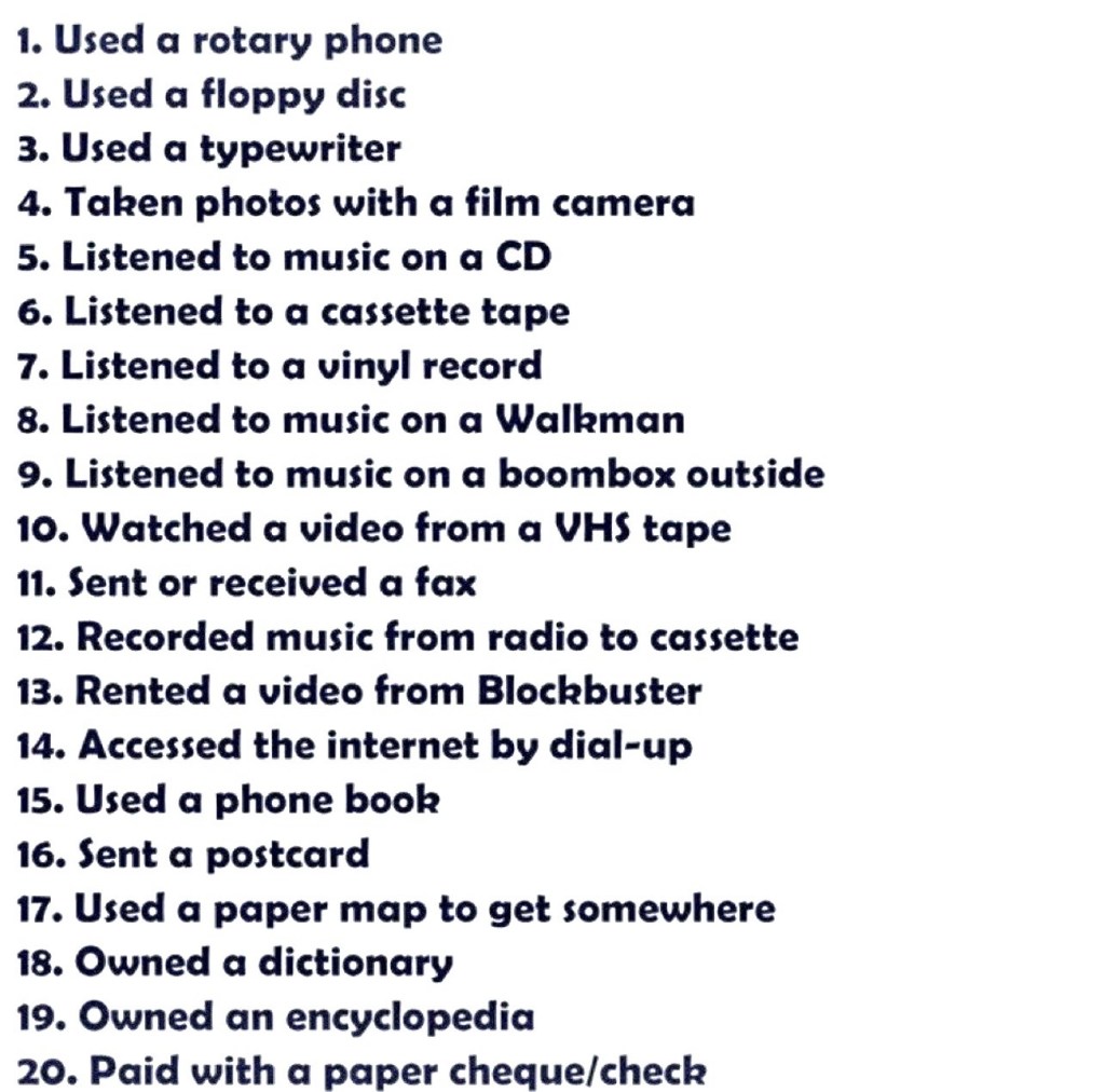Clearly I’m old as dirt because I’m 19 for 20… and the only reason it isn’t 20? I never owned a Walkman. Though the husband did and used it when jogging.