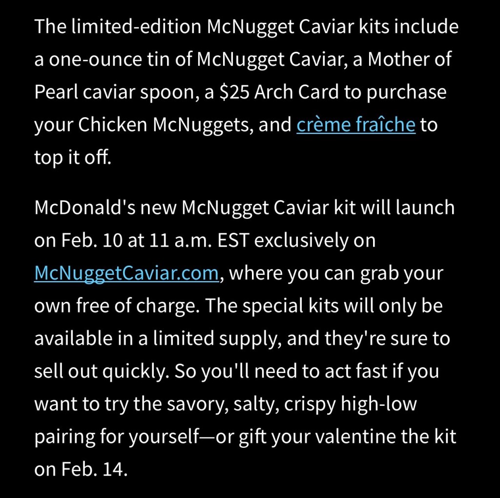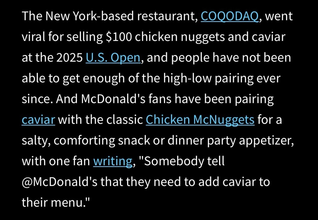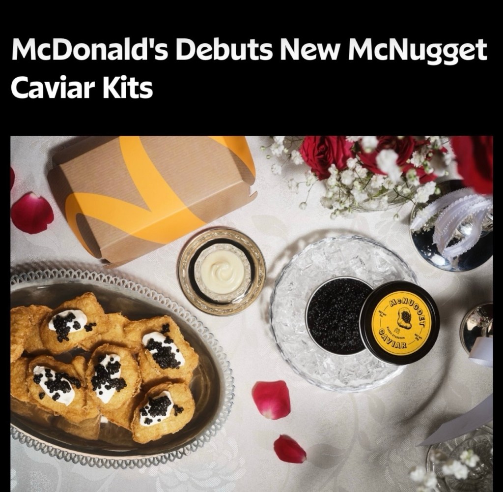 I have yet to attend a dinner party where nuggets and caviar has been served. Clearly I travel in the wrong social circles.