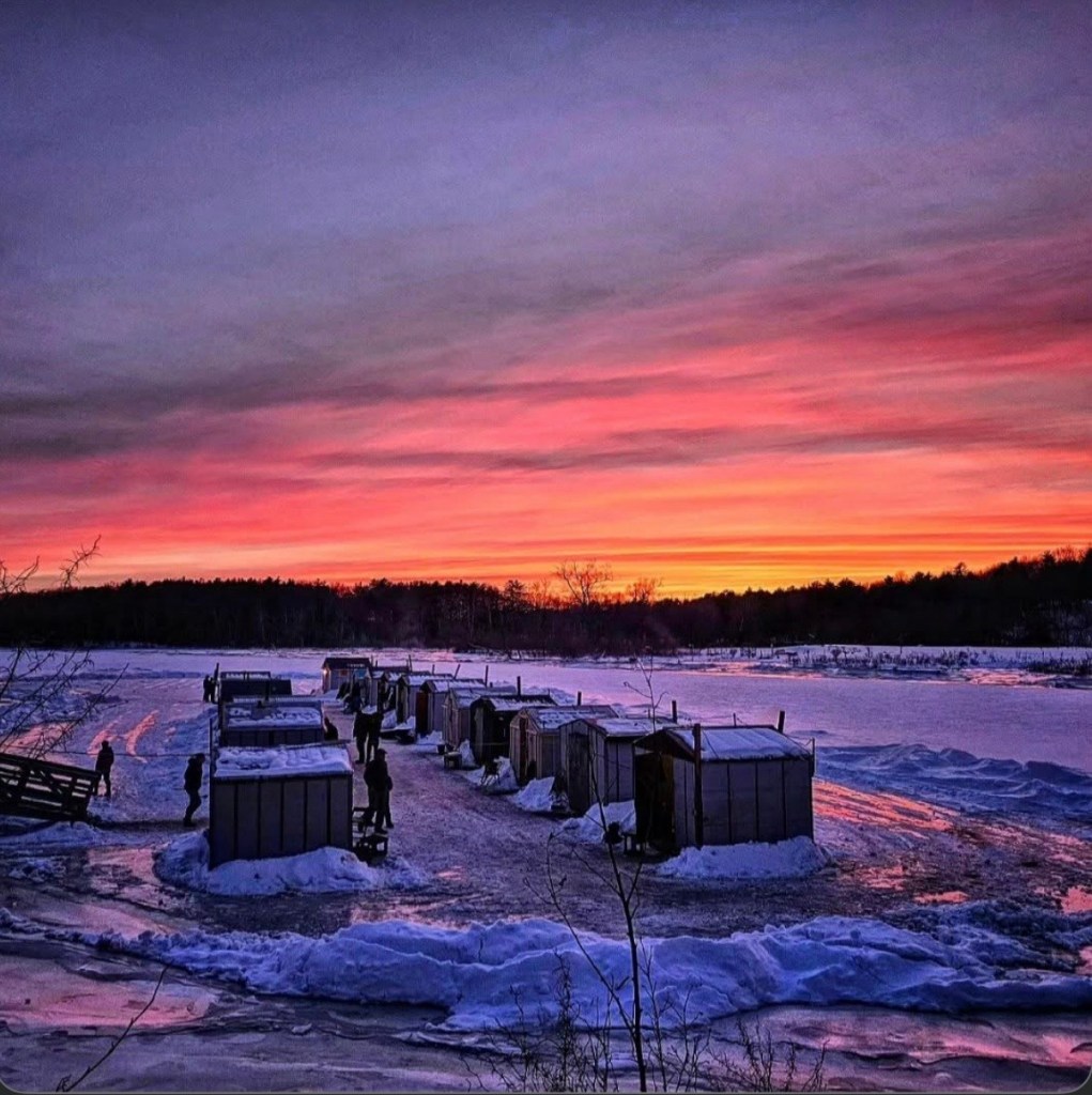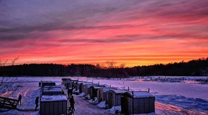 A photo of our local ice fishing camp at sunset.