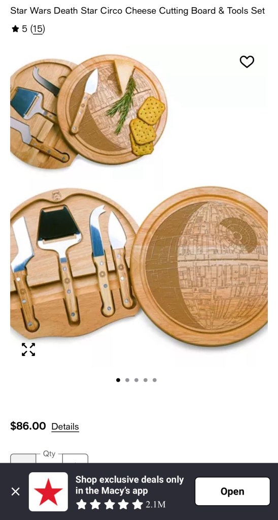 A brand new Star Wars Death Star cheese cutting set that we’re going to give to a friend who’s obsessed with the movies.