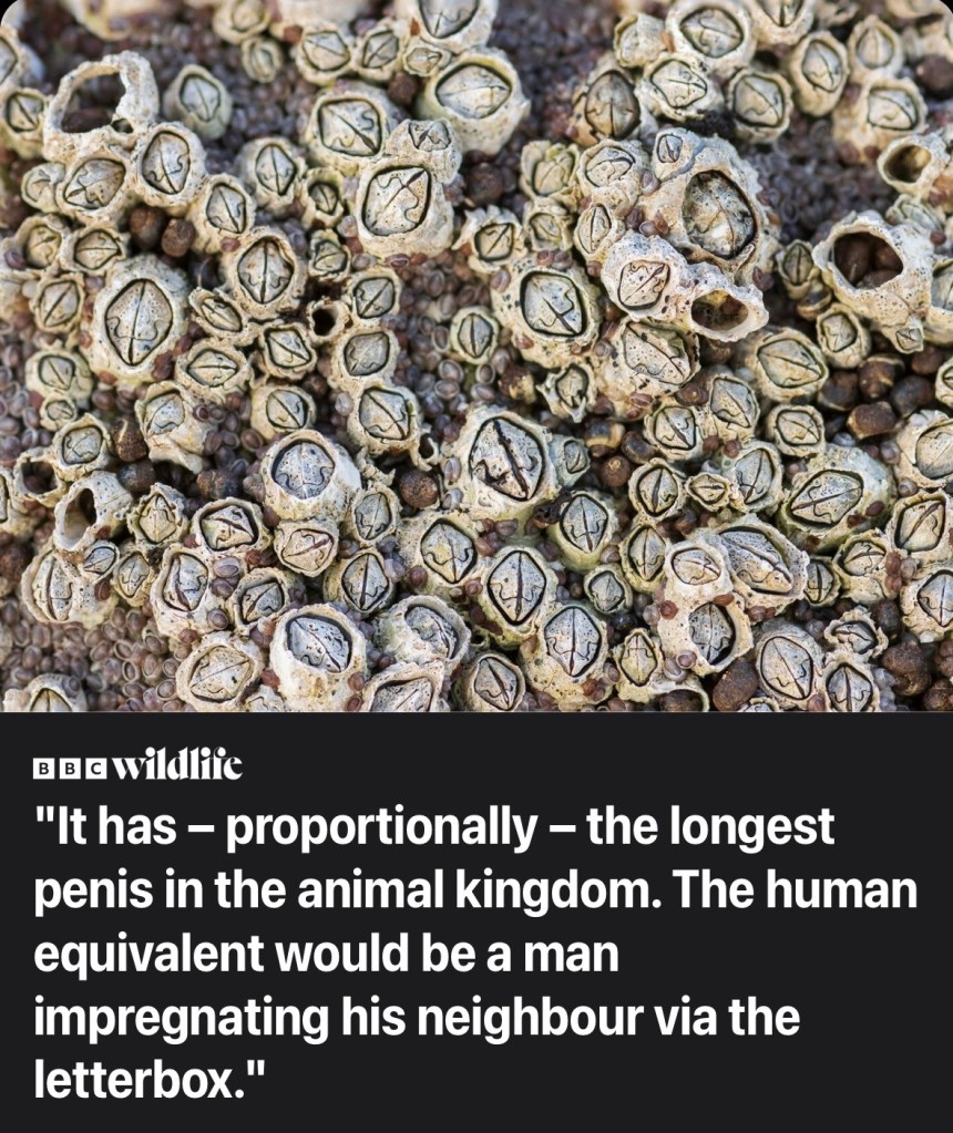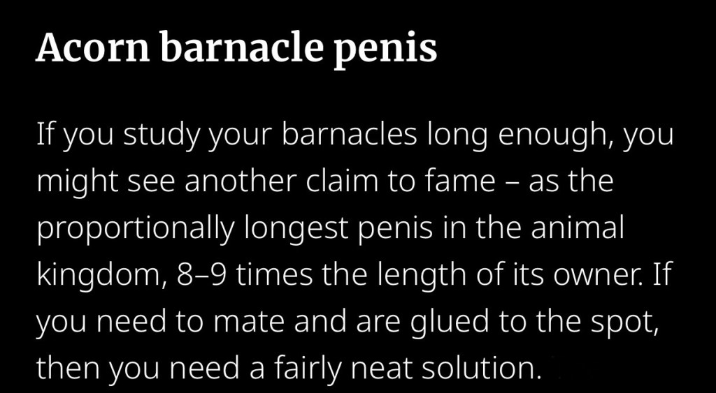 If the average male height in America is 5’9… and you multiply that by a barnacle equivalent of 8? You get an almost 46 foot long human member.