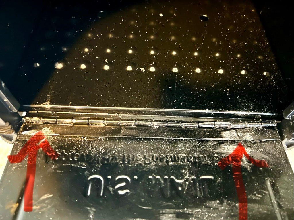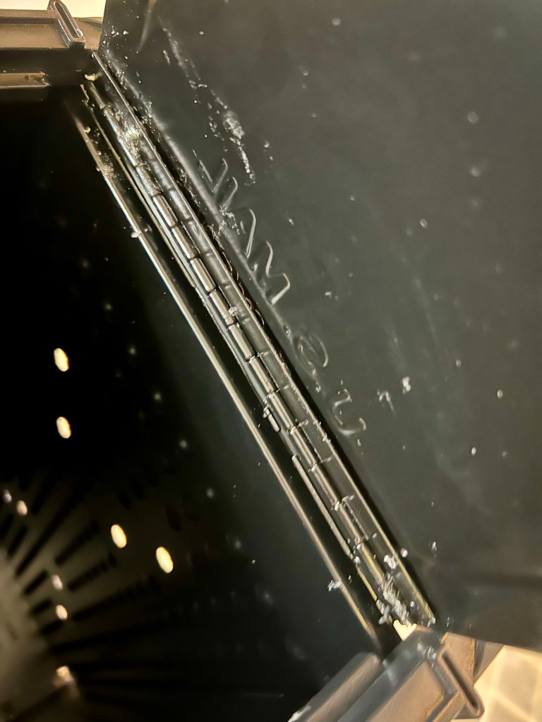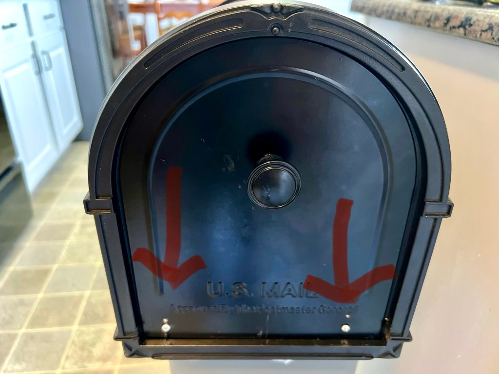 This stupid mailbox cost $100… but the door was only held on by a tiny bit of glue on the little hinge strip seen above.