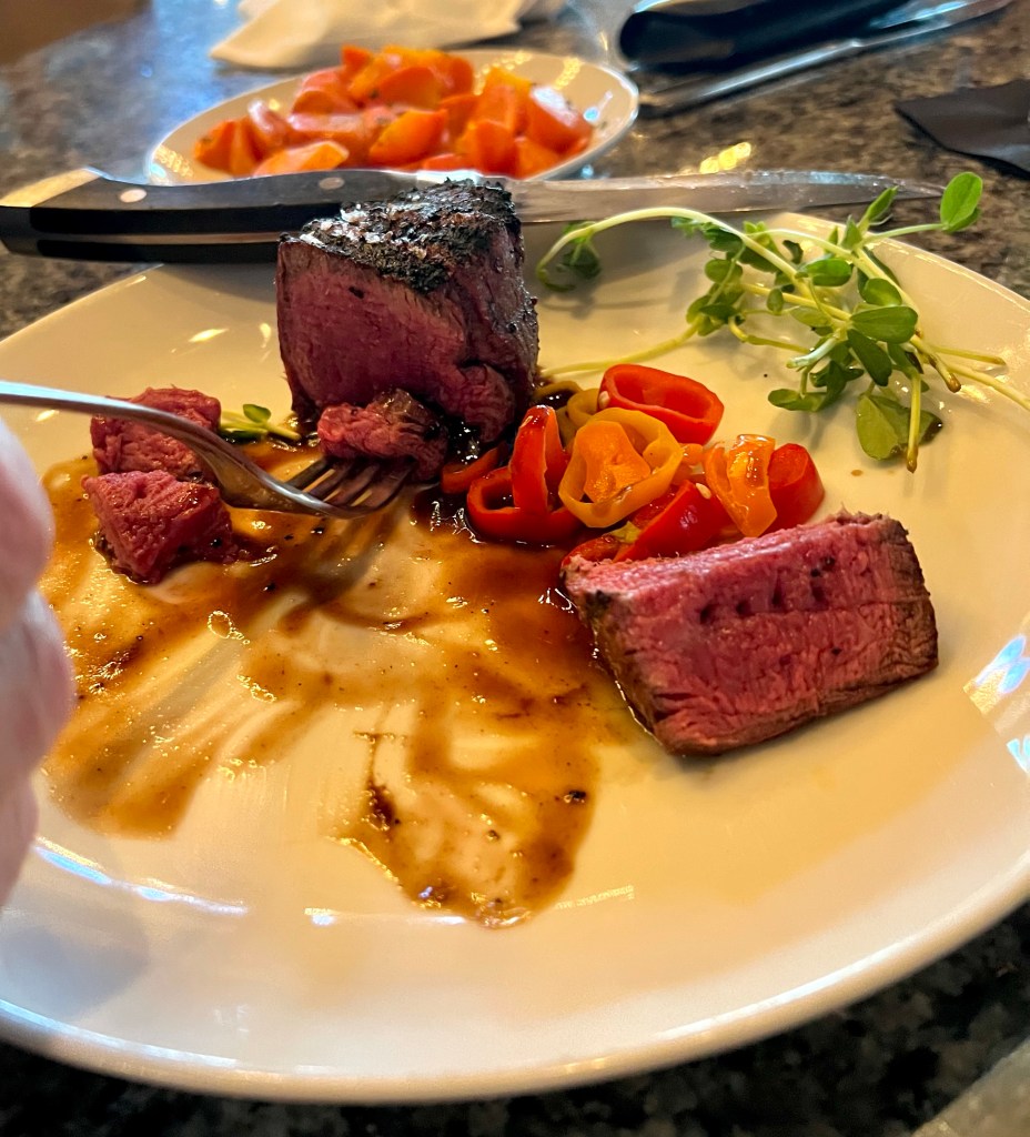 And a very rare Wagyu beef filet with red wine demi glacé, pickled peppers, pea tendrils and maple butter roasted carrots for the husband. Both meals were fabulous as usual and we shared a coffee crème brûlée that we devoured too quickly to photograph.
