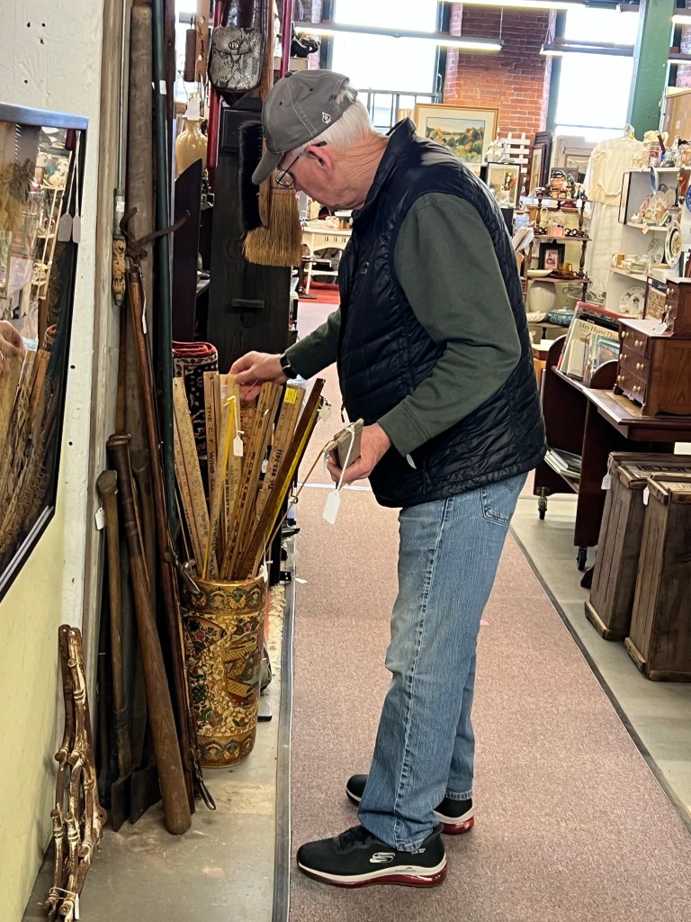 The husband has a weird obsession with vintage wooden advertising yard sticks and was bound and determined to come home with these… even though I assured him they wouldn’t fit in his bag.