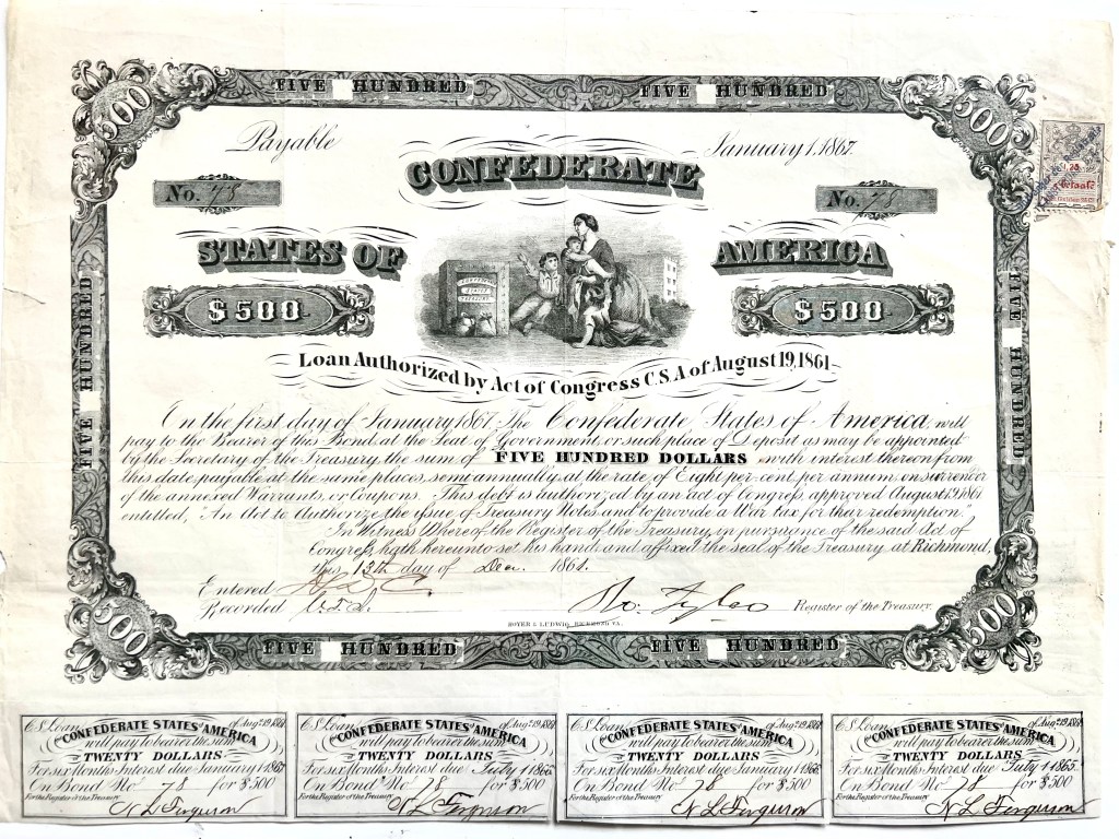 A $500 Confederate bond from the Civil War. When we lived down south I used to pick up Confederate currency now and then but I didn’t have one of these. It still has four coupons attached, though I think my chances of cashing them in are slim.