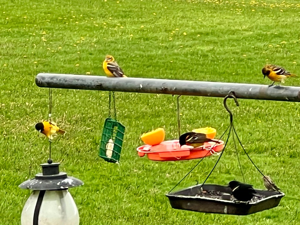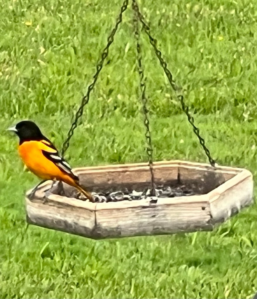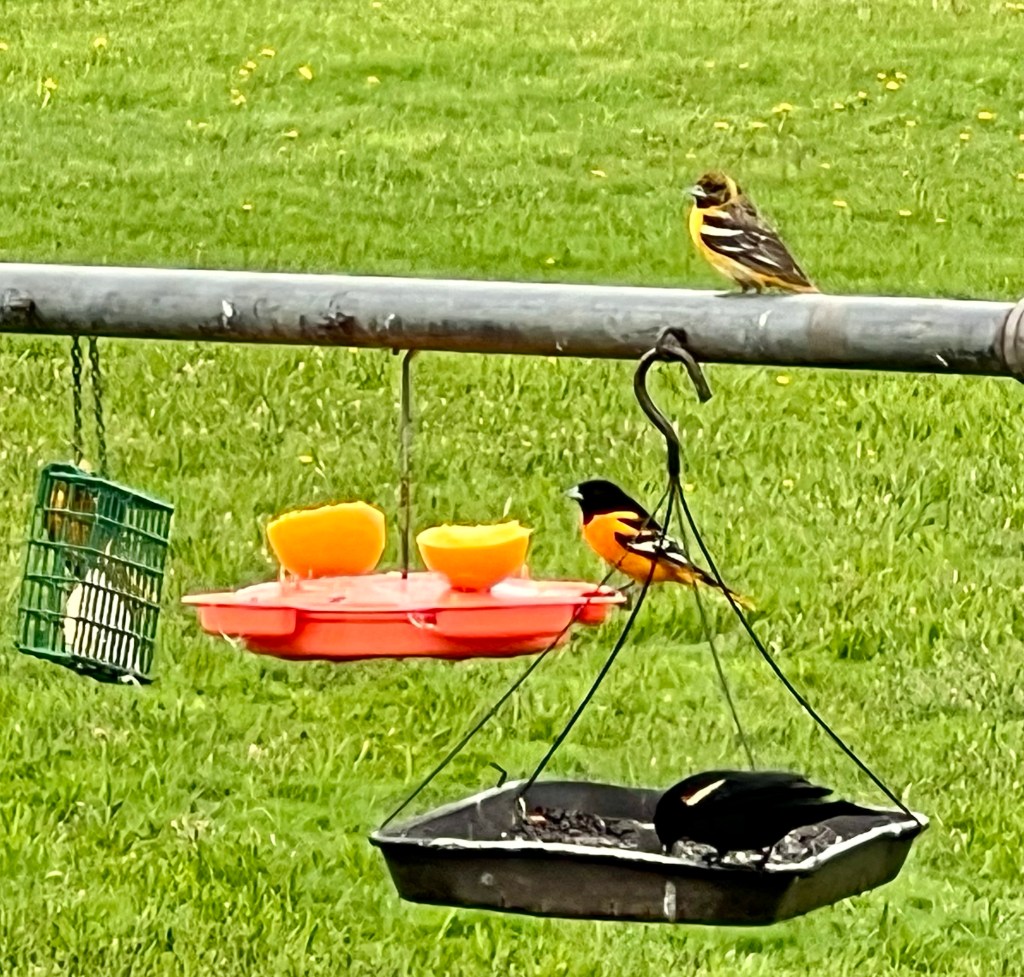I make sure to put out the special feeder containing orange halves and grape jelly when I spot my first flash of orange. Keep them happy and they’ll stay about a month before heading farther north.