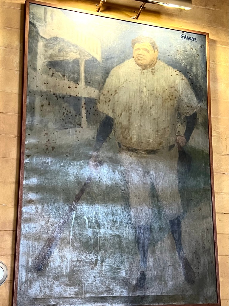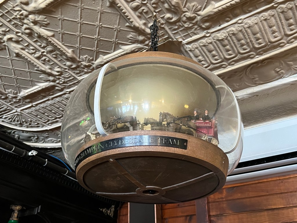 Above the bar? The antique Budweiser lamp my husband has been trying to cajole off his brother who owns the same one . When you switch it on, the lamp lights and the Clydesdales start walking. Real man cave material, but Darbys wouldn’t sell theirs either.