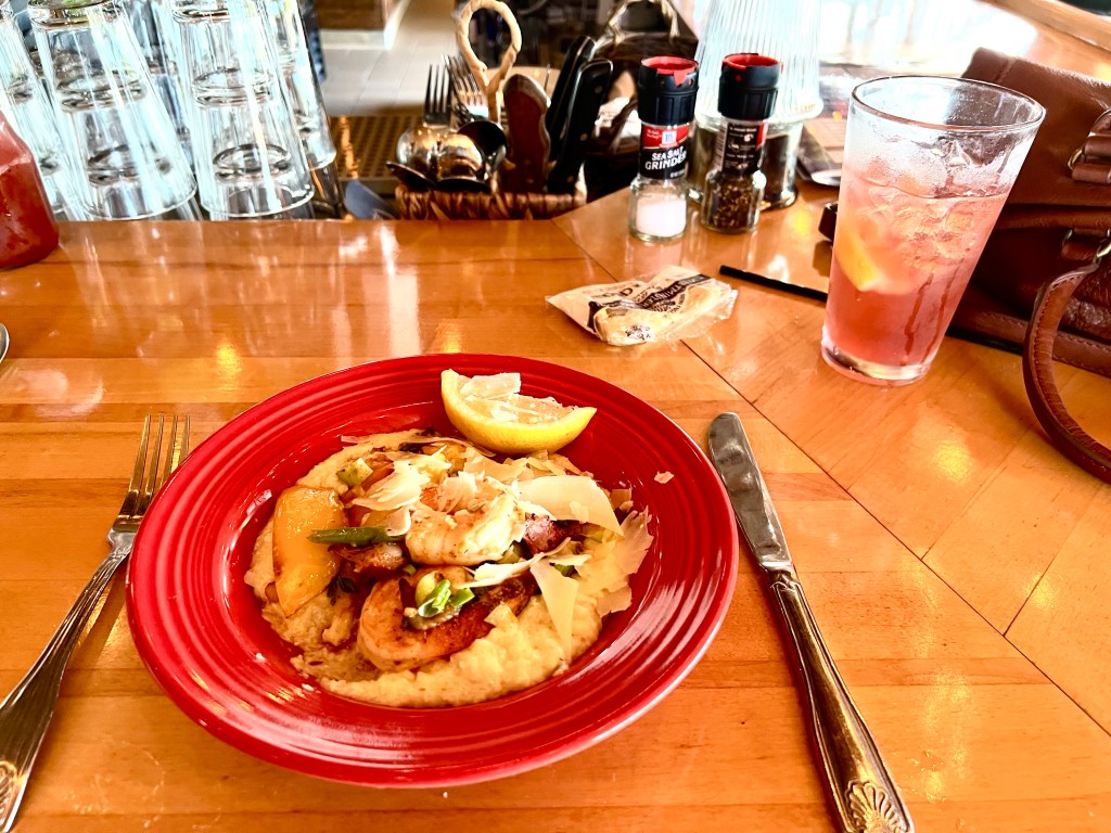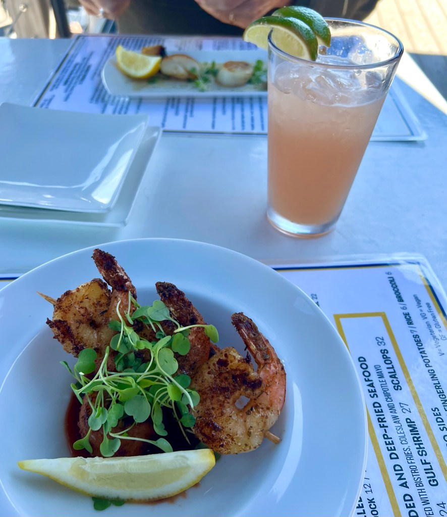 Saving the best for last, along with my pomegranate margarita I had blackened jumbo shrimp with fried balls of chorizo grits and smoky tomato sauce while the husband went with pan-seared scallops and crispy cornbread with an apple gastrique (apple cider, sugar, apple cider vinegar, calvados,thyme, chicken stock).
