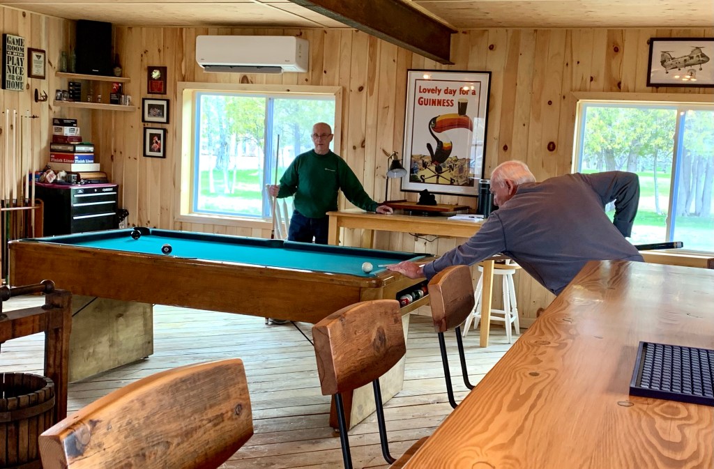 My husband went to breakfast last weekend and met up with his old cronies for the first time in almost a year. They’re a group of men who commandeer a large table at our local restaurant, drink endless cups of coffee and solve the world’s problems. Since he hadn’t seen them in a while, the husband filled them in on our storage barn to man cave transformation. When he got to the part about the pool table, an 85 year old gentleman said he loved to play…. so naturally he received an invitation.