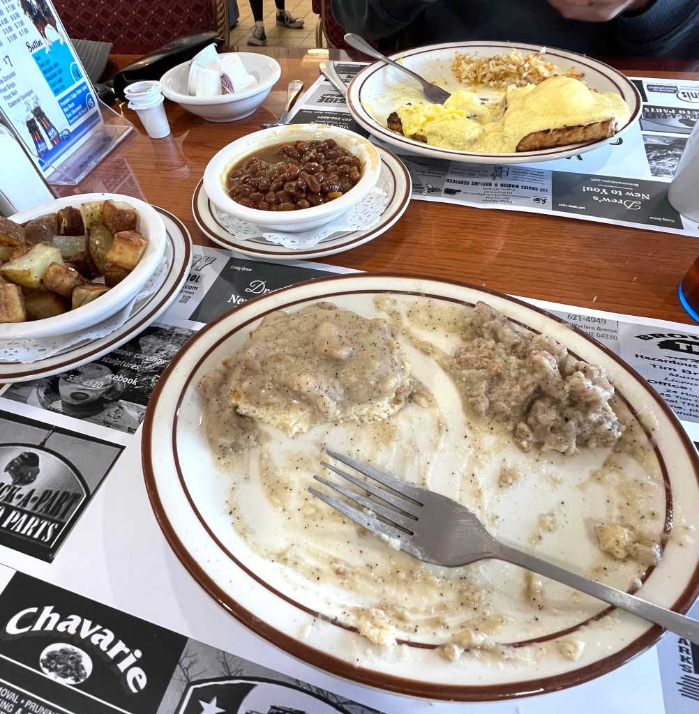 But I’d read good reviews so we plunged into the breakfast menu – where all the combos came with beans. You know you’re in Maine when.