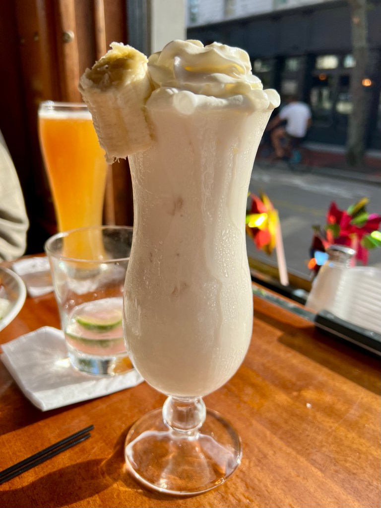 Rum Chata, Banana liqueur, White Crème de Cacao, fresh banana, vanilla ice cream and a splash of honey simple syrup blended frozen and topped with whipped cream.