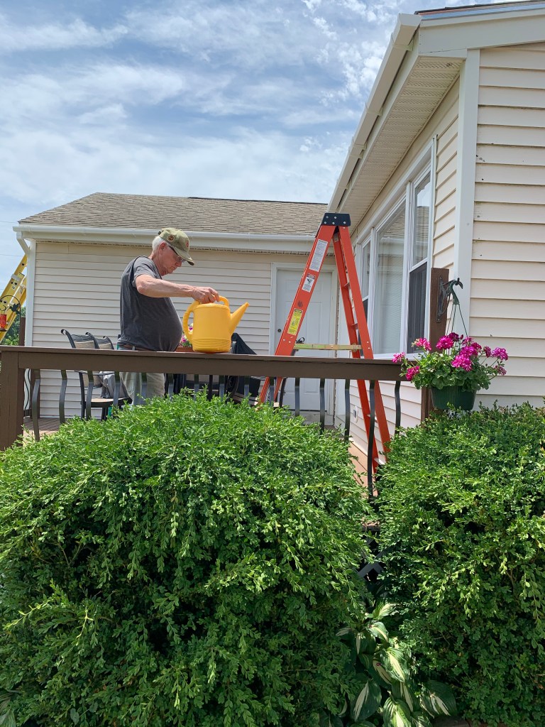 For some reason (Far be it for me to question his process. But I did… and was told to go back in the house) he decided to reroute the water’s path and secured the spout to the side of the corner post instead of the front.