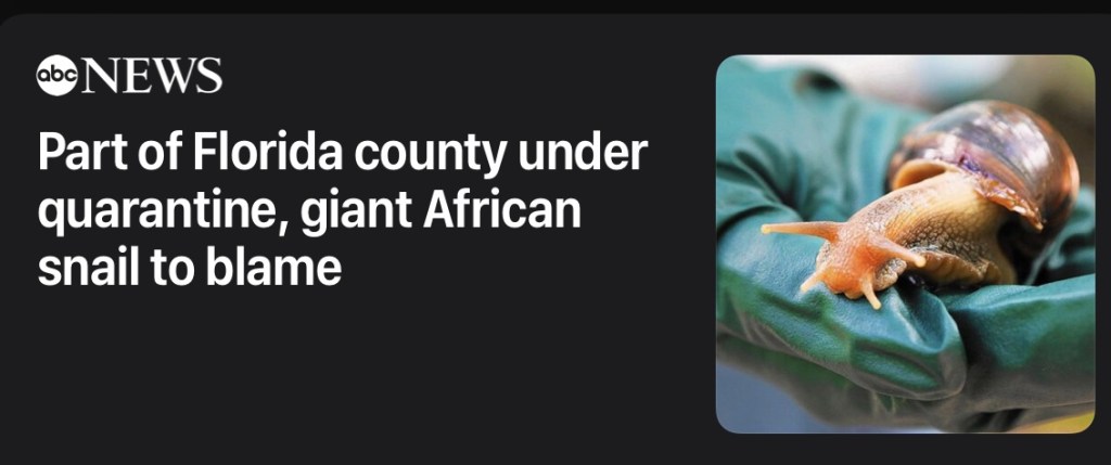 Unbearable heat. Sink holes that can swallow your house. Hurricanes. Anacondas and boa constrictors in the waterways. Now there are giant snails? Makes me glad I’m at the other end of I-95.
