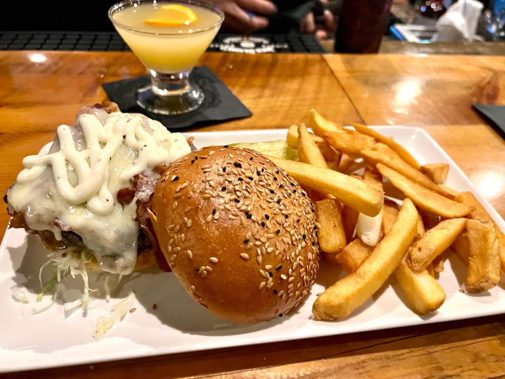 The Real Burger King Burger for me. Ground filet mignon and ribeye with caramelized onions, Swiss cheese, smoked bacon and truffle aioli.