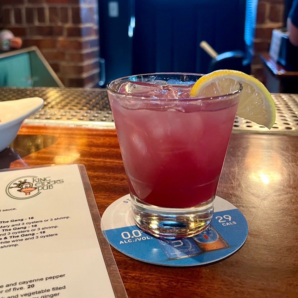 Gin, orange liqueur, lemon creamsicle simple and orange juice with a sugared rim.