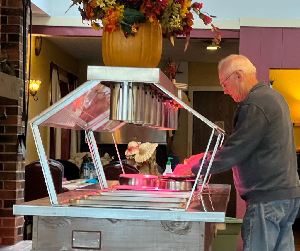 And we were pleasantly surprised to find our meals flavorful, well prepared and more than amply sized. Medium rare prime rib and stuffed shrimp with baked potato and broccoli for me, turkey dinner with mashed potato, stuffing and broccoli for the husband.