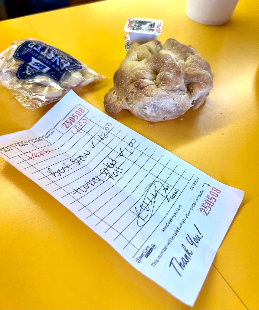Husband had a watery bowl of stew with a biscuit you could use for a boat anchor while I had a dry turkey salad roll the waitress mistakenly charged me $1 for instead of the $11 it cost. A dollar was really all it was worth, but the cashier caught the error and we moved on.