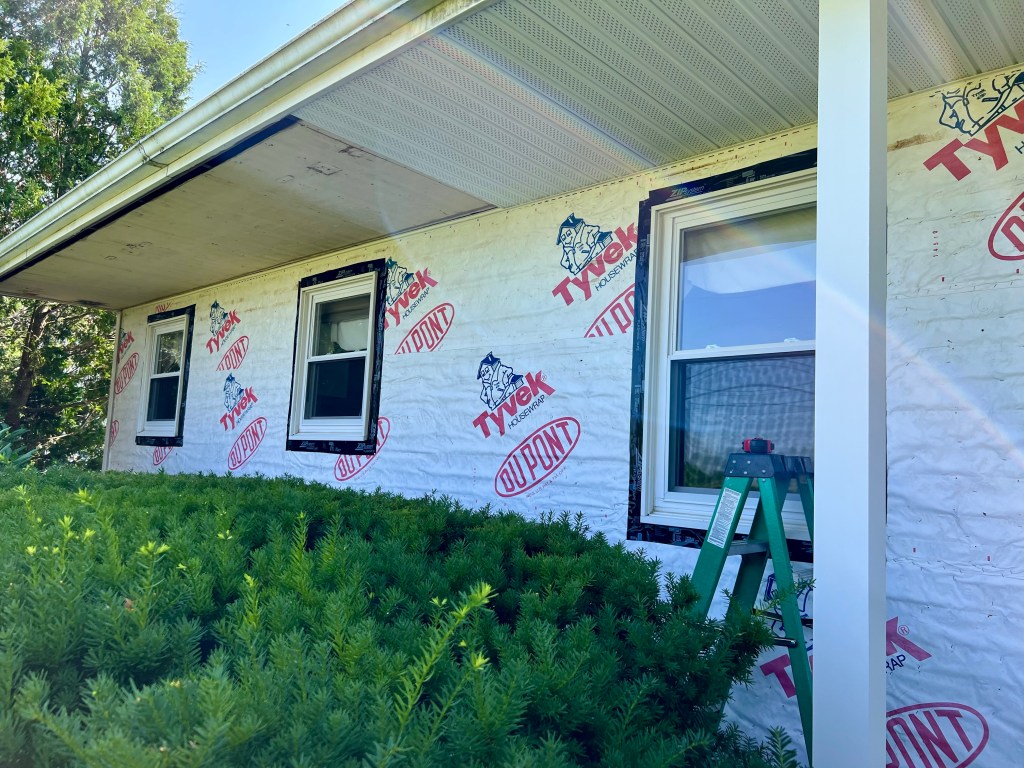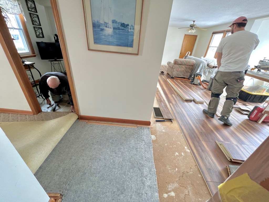 A giant truck with two pallets of stone and a forklift not only backed into the driveway, but off it at the same time.