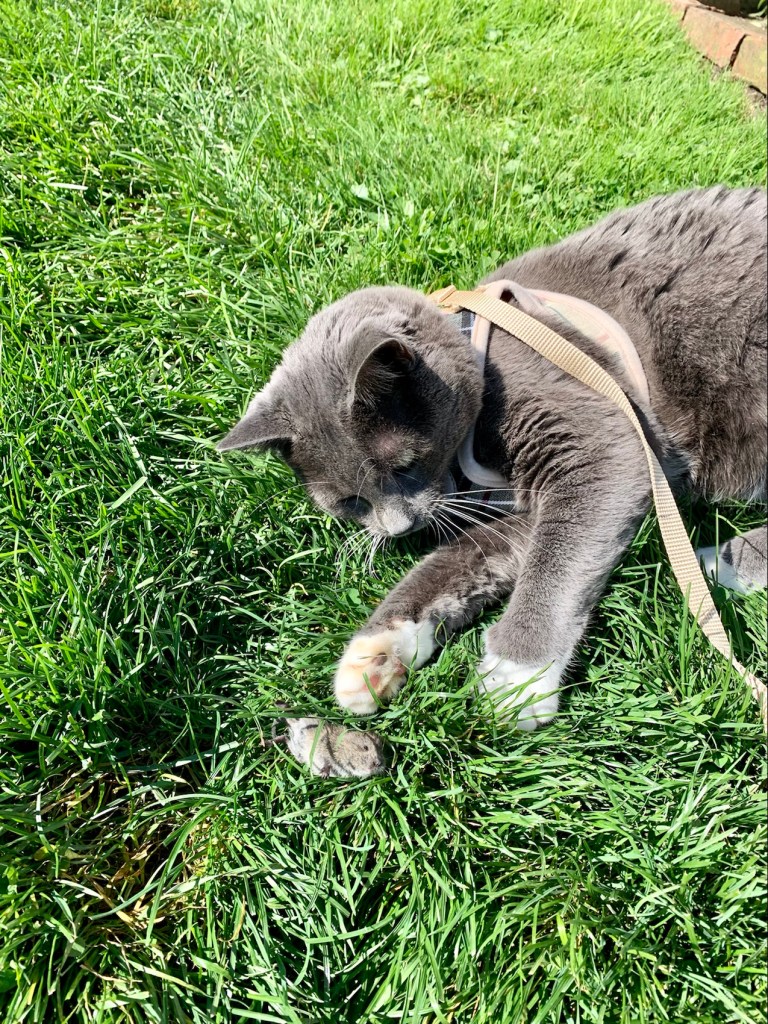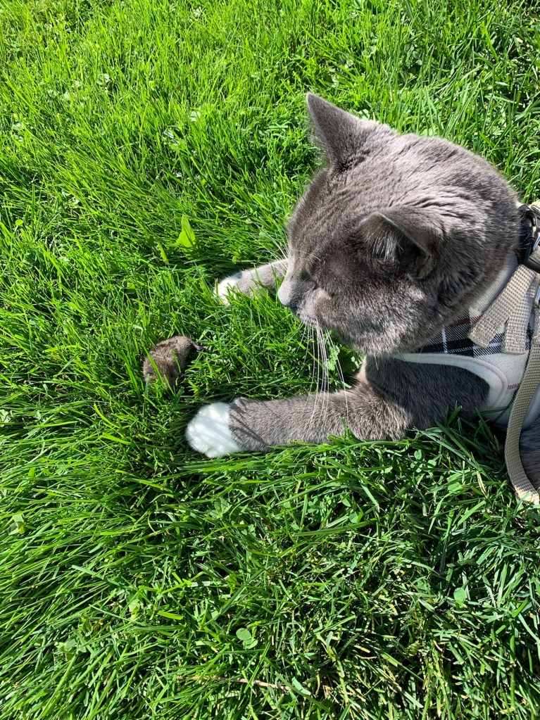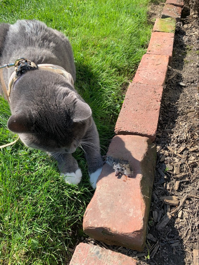 Patience paid off. He snatched a mouse out of a rock crevice and ran with it to the back door, which was thankfully closed. Rodent death was fairly quick this time around …