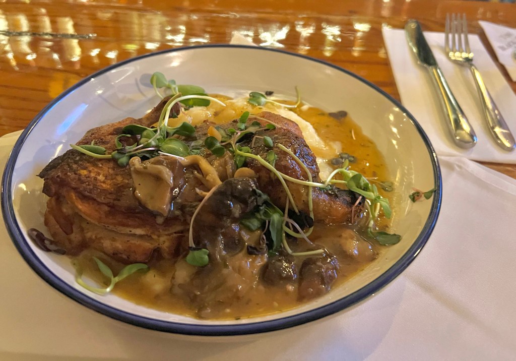 My pomegranate margarita and wild mushroom roasted chicken were wonderful but the husband was unimpressed by the menu and protested by just having chowder.