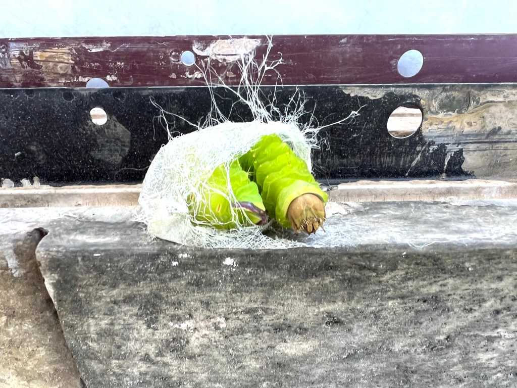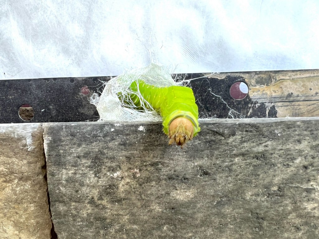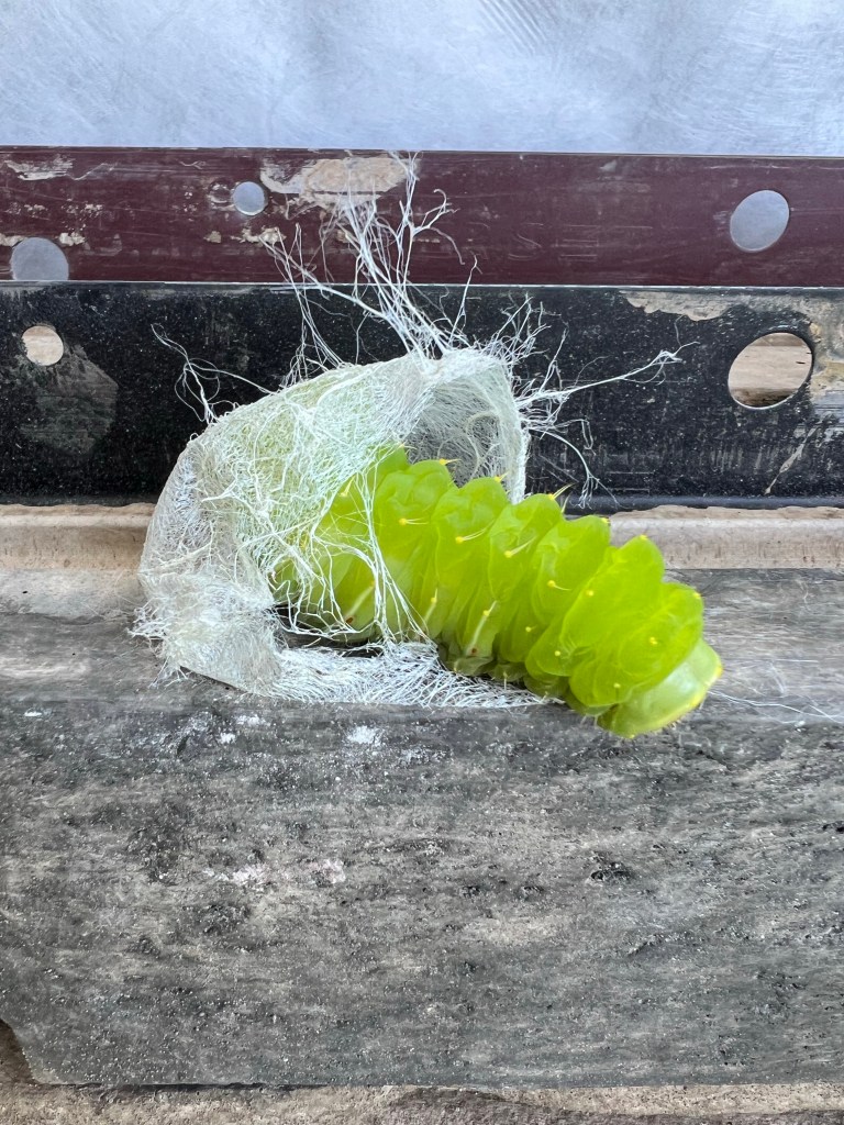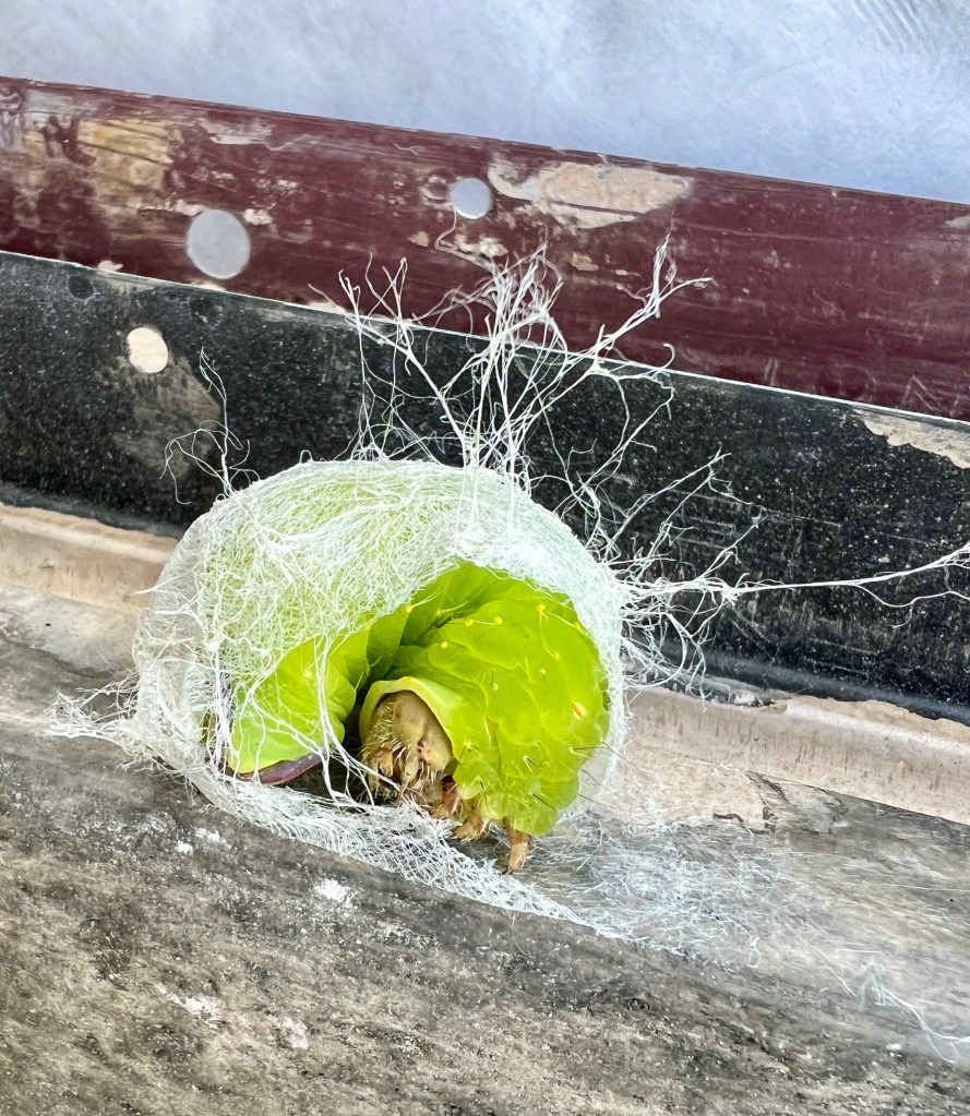 Our visiting Polyphemus caterpillar has decided to build his (her?) cocoon on our front porch!