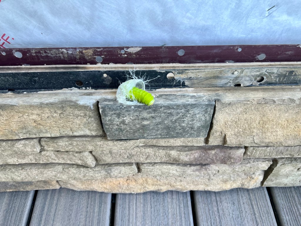 I discovered a Polyphemus caterpillar on a section of our stone siding.