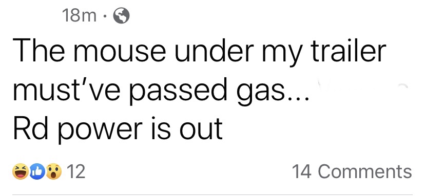 This is a running gag because certain parts of our town lose power quite easily. Flatulent rodents will probably strike here next, stay tuned