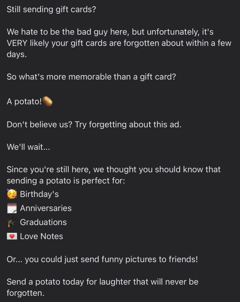 You may not know what it feels like to fall off the turnip truck, but in my town… apparently you can fall off the potato one.