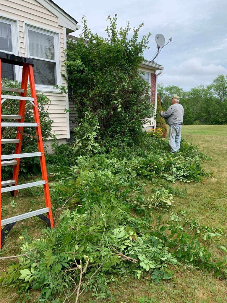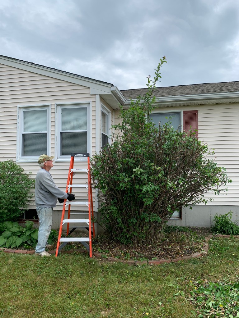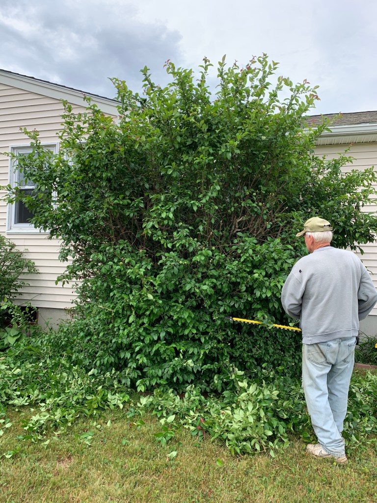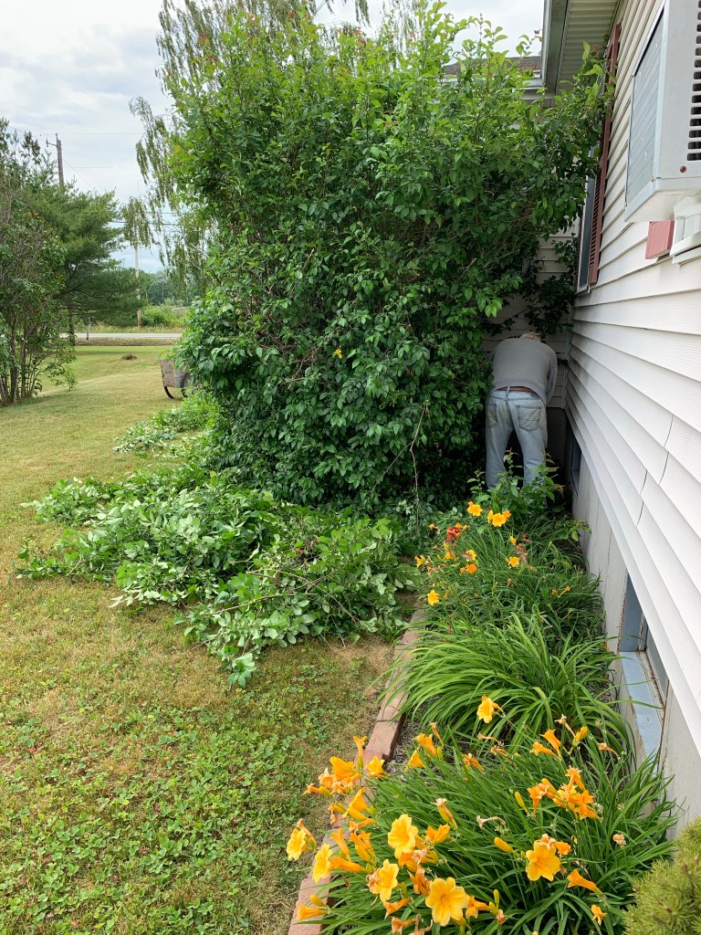 Heck, with the husband wielding the trimmer it isn’t even straight. But it’s smaller… and we can see out the windows again.